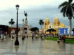Martin de Estete began the design of the streets of Trujillo by order of Diego de Almagro in the end of the year of 1534, so he designed the structure and dimensions of the Plaza de Armas. In 1841, Pedro de Mandalengoitia Sanz de Zarate donated to the square a fountain made of white stone that was built on his farm and mill in Santa Cruz de Carabamba.[1] On December 29, 1820, the Plaza de Armas was the scene of the proclamation of Independence of Trujillo by the Marquis of Torre Tagle. In this square are located the cathedral of the city and mansions dating back to the Hispanic and republican periods. On July 4, 1929, in the middle of this square, the Freedom Monument was opened, which represents the country's independence process and according to "commentators it represents the most precious of human beings, the love of freedom, the memory and recognition of the distinguished men who gave us independence". The statue was a work in Germany,[2] the materials used are marble and copper, the sculptor was Edmund Moeller and it was armed by Henry Albrecht.
