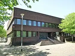 The new building was designed by the Property Services Agency in the Modernist style, built in red brick at a cost of £7 million,[6] and was opened in 1982.[7][8] The design involved an asymmetrical main frontage facing east onto a small courtyard. It featured a small flight of steps, to the left of centre, leading up to an opening containing three doorways. The building was fenestrated by a rows of casement windows on two floors with brickwork above and below. A Royal coat of arms, formed from cast iron, was mounted on a brick pedestal just to the right of the steps. Internally, the building was laid out to accommodate nine courtrooms.[9]