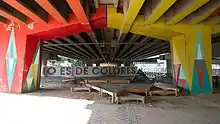 Puente de Colores is a landmark and open-air arts and culture social centre in the San Cristóbal de los Ángeles ward of Madrid, Spain, at the most prominent entryway to the neighborhood. The project to transform the undeveloped area beneath an Avenida de Andalucía overpass into a functional venue began in 2012 as collaborative effort between community-development project Autobarrios, architects, artists, and local residents. The plan was completed in 2014, though development continues. and Puente de Colores, hosts educational and cultural activities, including a TED event, and has a playground. Its name means 'Bridge of Colours' in Spanish.
