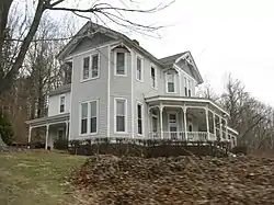 It is a balloon-frame house with a two-story T-plan, plus a one-story wing.[2]