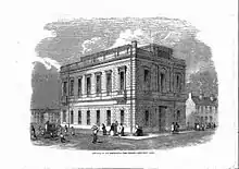 The building was registered as the meeting-house of a society of dissenters by the name of "Rational Religionists". Buchanan and another "social missionary", Lloyd Jones, came forward, willing to take oaths under some conditions.[1][6] Kidd, aided by T. P. Bunting, son of the Wesleyan minister Jabez Bunting, had the magistrate put to Buchanan the oaths that by statute were required from dissenting ministers.[1] Buchanan postponed the decision, costing him some derision from the secularist side, but eventually swore. Bunting then managed to draw from him a declaration that he did not believe in the orthodox doctrines of damnation. The matter ended with Buchanan being fined.[3]