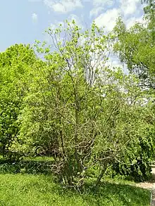 The Persian willow is a 2.5 to 10 meter high shrub or tree with striped wood. The twigs are thick, red, with gray tomentose hair up to the second year and later glabrous. The flower buds are egg-shaped, 6 to 9 millimeters long, 4 to 6 millimeters in diameter, blunt or pointed. The foliage leaves have kidney-shaped or half- heart -shaped stipules 1.5 to 6 millimeters long, falling off early. The petiole is 4 to 12 millimeters long. The leaf blade is 5 to 15 centimeters long, 3 to 6 centimeters wide, obovate to elliptical-lanceolate, usually half as wide as long, with a pointed or blunt end, a rounded to broadly wedge-shaped base and a more or less wavy and irregularly serrated leaf edge. 15 pairs of nerves are formed. Both sides are initially hairy, the top later becomes bald and is then shiny green. The underside is blue-green and gray haired pressed.[2][1]