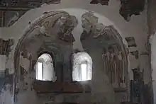 The interior has early medieval frescoes discovered first in 1897. Over the next century, a restoration brought to light more frescoes. The apse has a fresco depicting Christ in Majesty inside a mandorla, above six deacons. Below this register is scene of 10 armed knights and a mother and child are depicted. Other romanesque frescoes are visible on the ceiling. The counter-facade depicts the Last Judgement and three patriarchs painted circa 1060 circa.[1][2]