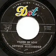 "Soldier of Love (Lay Down Your Arms)," also known as "Soldiers of Love,"[2] is a 1962 song written by Buzz Cason and Tony Moon[3] It was originally recorded by soul artist Arthur Alexander and released as a B-side of the single "Where Have You Been (All My Life)", which reached #58 in the Billboard Hot 100 in June 1962. The song was later covered by The Beatles during a 1963 session at the BBC, released on the 1994 album Live at the BBC. It was also covered by The Kaisers, Marshall Crenshaw, Pearl Jam, Little Steven, and The Derailers.