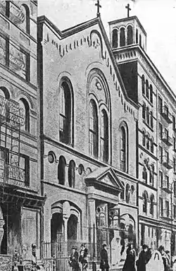 In 1914, the parish consisted of 18,000 Italian immigrants and second-generation Italian-Americans.[2] The church owned three buildings then, of which one it had planned to turn into a parochial school.[2] The Romanesque church tower, built 1888, at 22 Roosevelt Street "was a harbinger for Judson Memorial Church".[1]