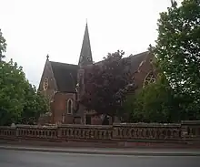 Thomas Talbot Bury designed St John the Evangelist's parish church in a 13th-century Decorated Gothic style with elements of the Geometrical style. It is built of red brick with large areas of yellow and black brick, and there are stone dressings on parts of the exterior.[9][17][20][21] The brickwork is in Flemish bond, and the roof is tiled.[9] The plan comprises a 3½-bay nave, chancel, clerestory, north and south aisles and transepts, entrance porch to the south and three-stage tower to the northwest, topped by a tall tiled spire.[9]