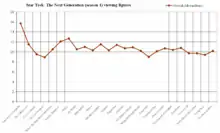 - 1 2 3 4 5 6 7 8 9 10 11 12 13 14 15 16 17 18 19 20 21 22 23 24 25 26 27 "Star Trek: The Next Generation Nielsen Ratings – Seasons 1–2". TrekNation. Archived from the original on October 5, 2000. Retrieved March 31, 2013.