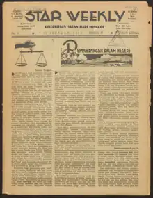 Star Weekly was the group effort of a number of Peranakan journalists who had been active in the late colonial era in the Dutch East Indies but who had been censored or even imprisoned during the Japanese occupation of the Dutch East Indies.[1] It was launched in January 1946 as a monthly magazine published by the daily newspaper Keng Po and its publisher Khoe Woen Sioe.[2][3] (According to some sources, it was a relaunching of a short-lived magazine published by Keng Po from 1939 to 1941 called Star Magazine, although that publication had a different format and editorial board.[4]) The first editor-in-chief of Star Weekly was Tan Hian Lay.[1] Petrus Kanisius Ojong, a prominent businessman and journalist who was editor-in-chief of Keng Po, joined the editorial board and writers of Star Weekly and would soon become one of its key figures.[1][2] Like Keng Po, Star Weekly was loosely affiliated with the Socialist Party (Indonesia). Because the Indonesian National Revolution was still underway, and Star Weekly was published in Dutch-held territory, it had to abide by censorship of military reports and be wary of seeming to be a tool of the Indonesian Republicans.[5] During the wartime years the paper also advocated for the Chinese population of Displaced Persons in Java who did not have the support of a foreign embassy due to the ongoing Chinese Civil War.