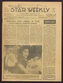 In the late 1950s, with the transition to the Guided Democracy period, the magazine suffered from increased state censorship and persecution.[7] It parent newspaper Keng Po rebranded itself Pos Indonesia (Indonesia Post) in 1958, and Star Weekly was likewise pressured to become more "Indonesian" and less Chinese.[8] New press regulations introduced in 1960 required publications to declare loyalty to the government and its aims, which many serious publications balked at.[10] The magazine started to be hit with repeated sanctions and printing restrictions from the government, and its editors started making plans for what to do if it was shut down completely.[1][8]