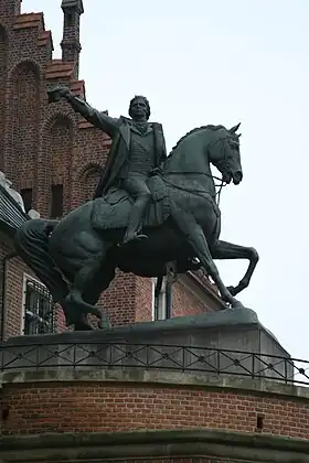 Tadeusz Kościuszko Monument in Kraków (Polish: Pomnik Tadeusza Kościuszki w Krakowie), is one of the best known bronze monuments in Poland. It is the work of artists: Leonard Marconi, professor of Lviv University born in Warsaw, and his son in law, sculptor Antoni Popiel. The equestrian bronze statue of Kościuszko—Polish and American hero of independence—is located along the west side entrance to the Wawel Castle in the Old Town.[1][2]