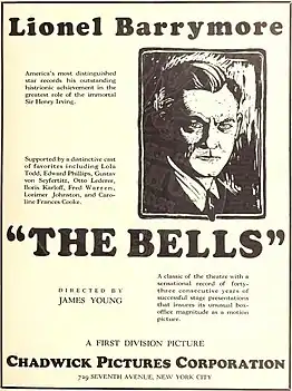 The Bells is a 1926 American silent crime film directed by James Young and starring Lionel Barrymore and Boris Karloff.[1] It was based on an 1867 French stage play called Le Juif Polonais (The Polish Jew) by Erckmann-Chatrian. The play was translated to English in 1871 by Leopold Lewis at which time it was retitled The Bells. The English version of the play was performed in the U.S. in the 19th century by Sir Henry Irving. Le Juif Polonais was also adapted into an opera of the same name in three acts by Camille Erlanger, composed to a libretto by Henri Cain.[2][3]