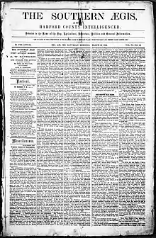 The Southern Aegis, and Harford County Intelligencer was a conservative Unionist newspaper which was published from March 22, 1862, to March 11, 1864, in Bel Air, Maryland by a prominent local lawyer, A.W. Bateman. After purchasing the paper as a pro-Confederate publication titled The Southern Aegis from John Cox in 1862, Bateman slightly altered the name of the paper as well as its political stance. In 1864, the title was again changed to the simplified The Aegis & Intelligencer, and Frederick W. Baker became the new publisher and editor.[1] Baker sold The Aegis & Intelligencer to John D. Worthington, Sr. in 1904, but kept its name until 1923, when it was changed to The Aegis.[2][3][4][5][6][7][8]
