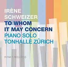 To Whom It May Concern: Piano Solo Tonhalle Zürich is a live solo piano album by Irène Schweizer. It was recorded on April 11, 2011, at Tonhalle, Zürich in Zürich, Switzerland, in celebration of the pianist's 70th birthday, and was released later that year by Intakt Records. The music includes originals plus tunes composed by Jimmy Giuffre, Carla Bley, Thelonious Monk, and Dollar Brand.[1][2][3][4]