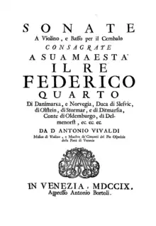 Antonio Vivaldi wrote a set of twelve sonatas for violin and basso continuo, Op. 2, in 1709. First published by Antonio Bortoli in Venice in 1709 (in movable type), the collection was later reprinted by Estienne Roger (who became Vivaldi's main publisher) in Amsterdam around 1712/13.[1][2]