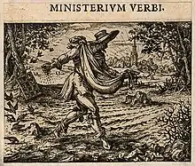 Verbi Dei minister (Minister of the Word of God), also verbi divini minister (Minister of the Divine Word), is a Latin religious title abbreviated V.D.M., denoting a minister or pastor within some Lutheran and Reformed churches. The expression dates from the Second Helvetic Confessions of 1562, where the Swiss reformer Heinrich Bullinger formulated a credo that came to spread throughout German speaking countries.[1] In the 2017 reader on the Reformation Jubilee, the Evangelical Church in Germany suggests that the reform theology of Martin Luther is not complete until Luther states that God's forgiveness and justification works through the Word of God, thus making the pastor a verbi divini minister.[2]