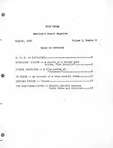 Vice Versa was the project of Lisa Ben (an anagram of "lesbian"), real name: Edythe Eyde, a secretary at RKO Studios in Los Angeles.[1][2] By her own account, she had "a lot of time to herself" at work[3] and, starting in June 1947, "twice each month typed out five carbons and one original of Vice Versa (a technique she had picked up as a member of science fiction fandom).[4] She recalled being told by her boss that he didn't care what she was typing, but he wanted her to "look busy" so people at the studio would think he was important.[5] She described the intention of the magazine being to create "a medium through which we may express our thoughts, our emotions, our opinions- as long as material was 'within the bounds of good taste'".[4]