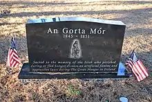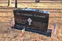 The Old Catholic Ground is an area in the cemetery used for Catholics, mainly (Irish) immigrants who arrived in the community in the early to mid 19th century, and for those who fled the Great Hunger from 1845 to 1852. People were buried in the Catholic section of the cemetery because there was no stand alone Catholic burial place in the community prior to 1858. The Catholic section is also known for headstones containing references to the names of counties in Ireland, and is built on what used to be known as Brown's Hill.[3] From 1858 through the 1870s, several dozen Catholic burials were removed from Western Cemetery and reinterred at the new Catholic Cemetery named Calvary Cemetery in South Portland, Maine when it opened in 1858. Calvary Cemetery is operated by the Diocese. In 1999, the Ancient Order of Hibernians, Division I, erected a stone marking the area as the Catholic Ground, and commemorating those who perished during, or fled from The Great Hunger (An Gorta Mór).