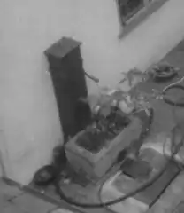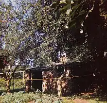 In the back garden of the house is a red sandstone building, cobbled inside, which was used latterly as the woodshed and fuel store (paraffin, diesel, etc.) A collapsed stable lay to the right-hand side as viewed from the front. The floor was lined with bricks with a central drainage channel and drain. This building had been two stories high and was probably used for the farm horses, the coach or "trap" horses, usually hackneys[4] being kept in the stable off from the central courtyard of the old farm buildings. Near the old greenhouse in the back garden was an "apple rack" with several drawers for storing the crop from the orchard. This apple rack was used until the 1970s when the structure became unsound and was not replaced. The rack can be seen in the drawing illustrated here.