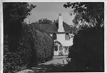 A duck pond was located nearby, but no sign of this remains. A number of white glazed earthenware eggs have been found in the soil around this spot, being used to encourage a broody hen or duck to lay more eggs. Cherry laurel bushes bordered the lawn on the right facing the bottom of the garden, together with a boat-shaped box hedge. The path was edged with stones that seem to have been removed from a "Devon hedge", judging by their size and type. Rose of Sharon shrubs lined the path running to the old school room at the front of the house. Barked-wood poles were used to construct the arches that covered three of the exits from the front lawn, each having trailing roses trained onto them.