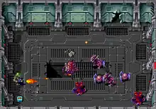 Xeno Crisis is a multidirectional shooter game similar to Robotron: 2084 and Smash TV.[1][2][3][4] The premise begins with Commander Darius receiving a distress signal from Outpost 88, a scientific research facility overrun by aliens. The space marines John Marsh and Sarah Ridley are dispatched on a drop ship to confront the aliens at the facility.[2][5] One or two players control either Marsh or Ridley, and work their way through seven procedurally generated levels. There are a number of enemies of various difficulty in each room, concluding with a boss battle at the end of most levels.[1][2][4][5] After enemies onscreen are killed, a chance of an item, a weapon drop, health, or dogtags are dropped to aid the player. Dogtags are used as in-game currency to buy upgrades such as additional health or increase the player character's speed. The starting machine gun has limited ammunition, and weapon pickups have a time limit, requiring players to stay on the move and on the lookout for ammunition boxes. Along the way, players will come across with survivors of the facility that can be rescued and released to safety.[1][2][3][4][5]