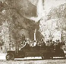 In November 1913, the first automobile stage replaced the horse-drawn stages for the 14-mile route from El Portal to Yosemite Valley. The 25-passenger White Motor Company buses completed the trip in one hour and thirty-five minutes, compared to the four-hour journey required by the old horse stages.[21] By 1915, passenger and freight revenue continued to increase, and eighty percent of the passengers during the summer season were tourists from the Eastern United States.