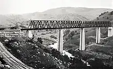 The entire roadbed for the Yosemite Valley Railroad was blasted out of solid rock, which required approximately 3,000,000 pounds of dynamite and powder and 285 miles of fuse. Three Howe truss bridges were built to cross the canyon's steep walls, located at Hopeton, Pleasant Valley, and Bagby, with a total of 65 smaller bridges and trestles along the route. The completed route had 63.5 miles of grades and 32.9 miles of curves with a maximum grade of 1-2%.[13] The main line had Bessemer rail weighing 70 pounds to the yard, and there were 505 curves, as well as 10,265 miles of yards and sidings.[3]: 15–16 A telephone and telegraph line was constructed along the route and completed on July 1, 1907, connecting Yosemite with the outside world.[14]