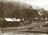 Tracklaying began on November 1, 1905, with the arrival of the first 10 carloads of rail.[8] To equip the railroad, the company purchased two locomotives from the Northern Pacific, a steam shovel, and a small narrow gauge work engine. During construction the company faced a shortage of labor, prompting them to advertise for 1000 workers at wages of $2.25 per day. The recruitment effort caused overcrowding in hotels and long lines at the employment office in Merced, prompting the company to expedite the hiring process with an arbitrary sign that read, "Bus leaves for camp each morning at 7 AM. Everybody can have a job. Don't ask questions!"[3]: 10 The workforce grew to about 1500 men in January 1906, but turnover was high due to the nature of the job.[3]: 11