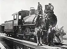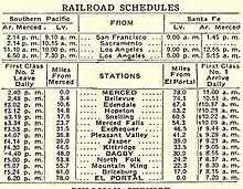 The Yosemite Valley Railroad's first regularly scheduled train left from the Santa Fe depot, which was located six miles outside of town, on December 18, 1905. This marked the exact three-year anniversary of the railroad's incorporation. The company was complying with its state charter, which required five miles of the railroad to be in regular operation within three years of the charter's granting.[9] Tracks were completed to Merced Falls on March 4, 1906, and the formal opening of the railroad's regular schedule took place on May 25, 1906.[10] Regular service marked the end of the stagecoach business along the route.[11]