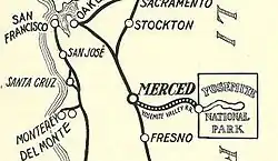 The Yosemite Valley Railroad (YVRR) was a short-line railroad that operated in California from 1907 to 1945, providing a new mode of travel and tourism for the region. It ran from Merced to the Yosemite National Park, but it did not extend to Yosemite Valley itself, as railroad construction was prohibited in the National Parks.[1] Tourists would disembark at the park boundary in El Portal, California and stay overnight at the Hotel Del Portal before taking a stagecoach to Yosemite Valley.