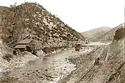 Construction to El Portal ran through rough foothill and mountain country, and supplies and equipment were transported by pack horses, ropes, sleds, two-wheeled horse carts, wheelbarrows, and drags for grading. By May 1907, the rails had almost reached the boundary of Yosemite National Park, but the government refused to give up more right-of-way for the train to enter Yosemite Valley. Thus, the railroad built a stagecoach road that ran the six miles from El Portal into Yosemite Valley at a cost of $73,260.[12]