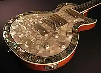 Metal front guitars also featured engraved designs made by his friend and customer Danny O'Brien,[6] who had started engraving plates for guitar headstocks until Zemaitis suggested O'Brien engrave the fronts as well.[5] Zemaitis' guitars became popular among rock artists and consolidated as a landmark of Zemaitis guitars.[7] In the mid-1970s, Zemaitis made his first "mother of pearl" fronts for Ronnie Wood and James Honeyman-Scott.[6]